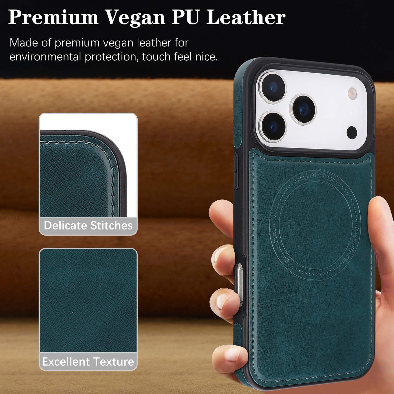 • Premium Vegan PU Leather: High-quality vegan leather provides a soft touch and elegant texture with fine stitching.