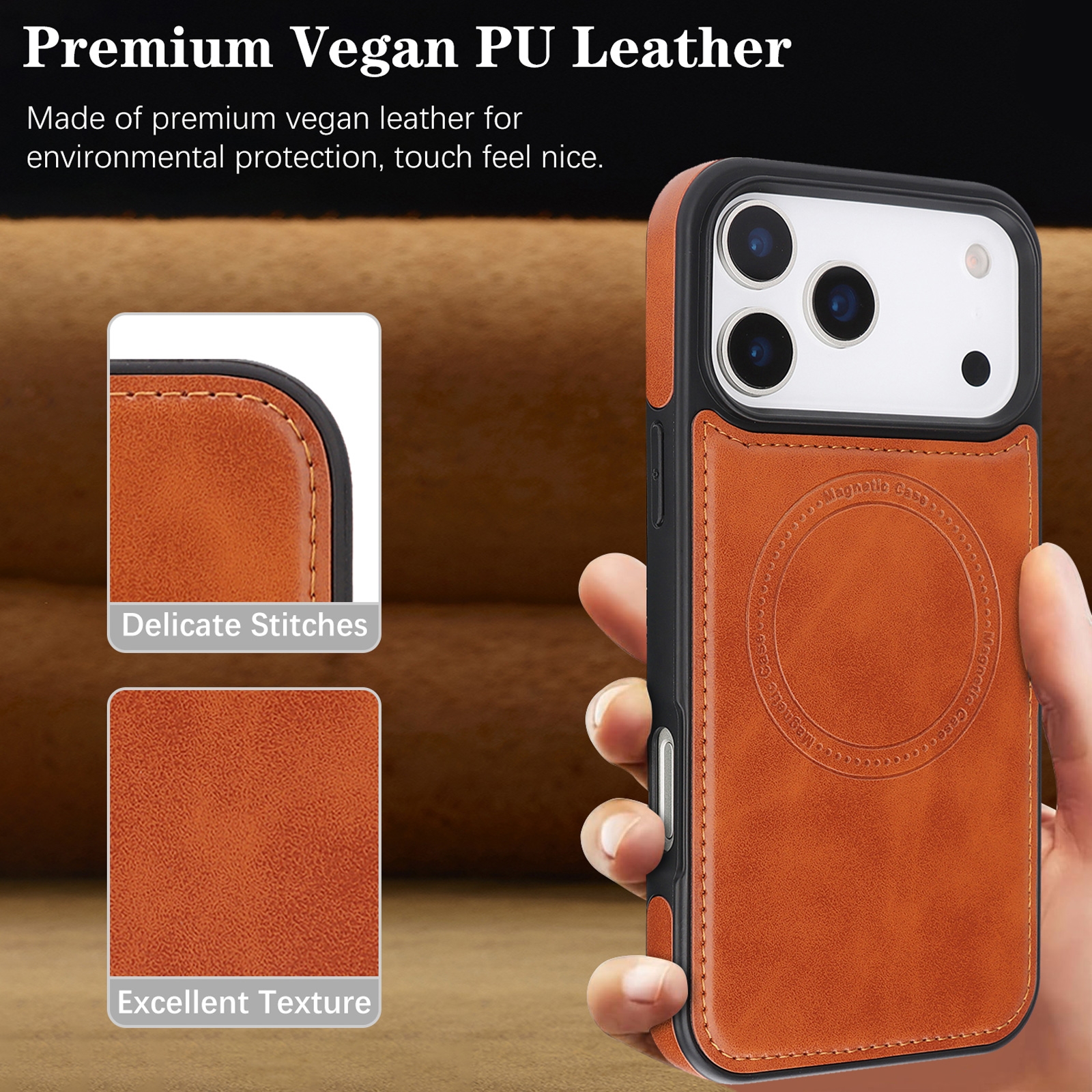 • Premium Vegan PU Leather: High-quality vegan leather provides a soft touch and elegant texture with fine stitching.
