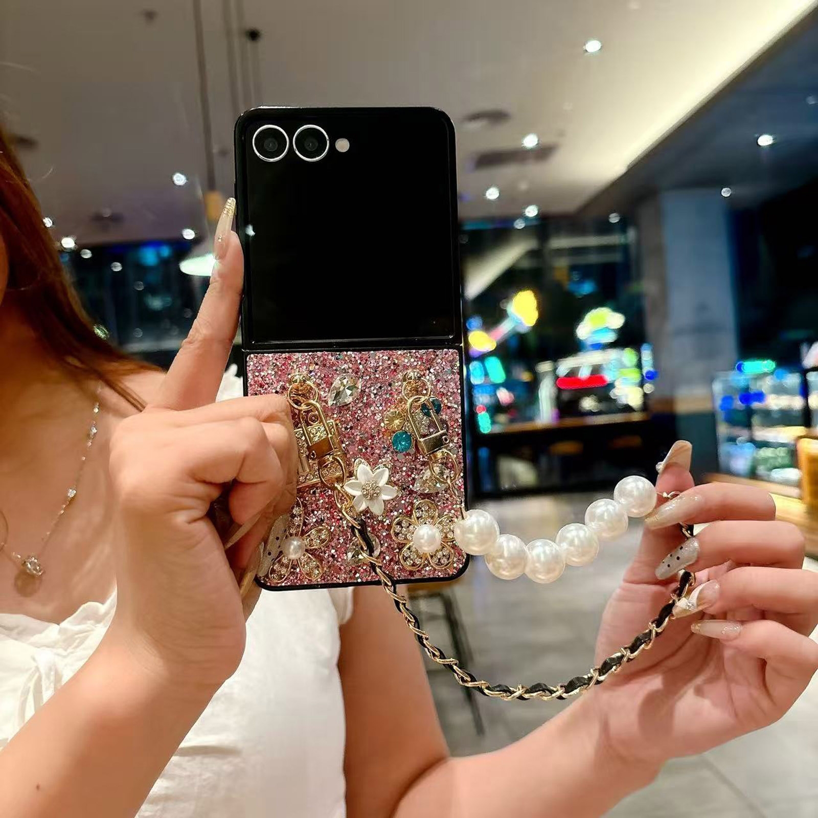 CS-UN-0060-2893PK Glitter Rhinestone Case for Z Flip7 with Pearl Leather Chain Strap - Pink (1PCS)