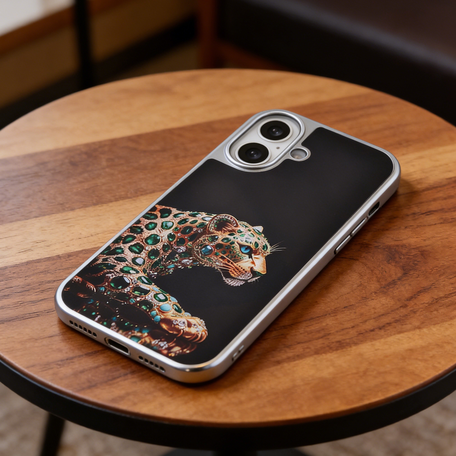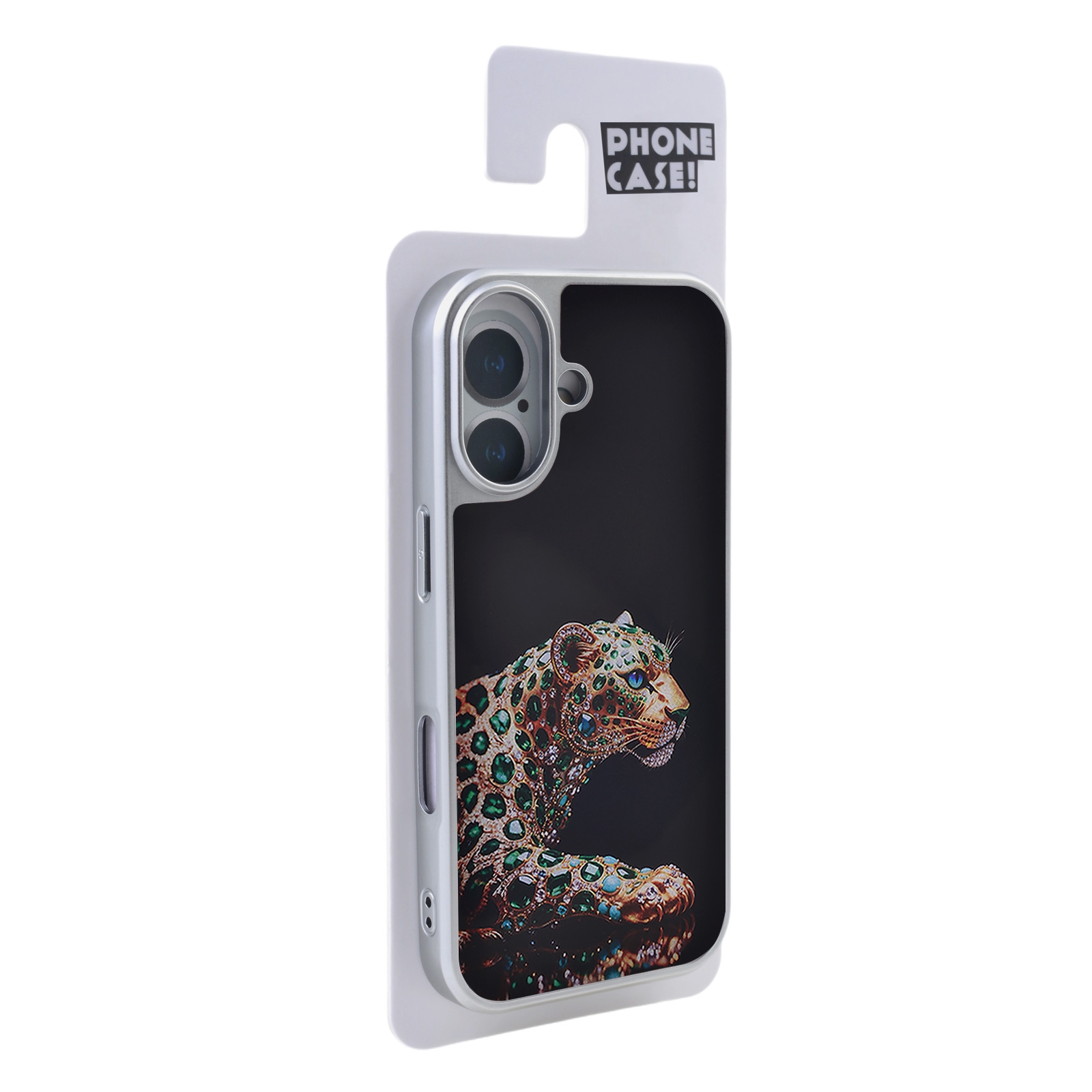 • Opulent Gemstone Graphic - The back panel displays a high-resolution, printed illustration of a leopard styled entirely from green gemstone and gold-tone motifs against a deep black background
