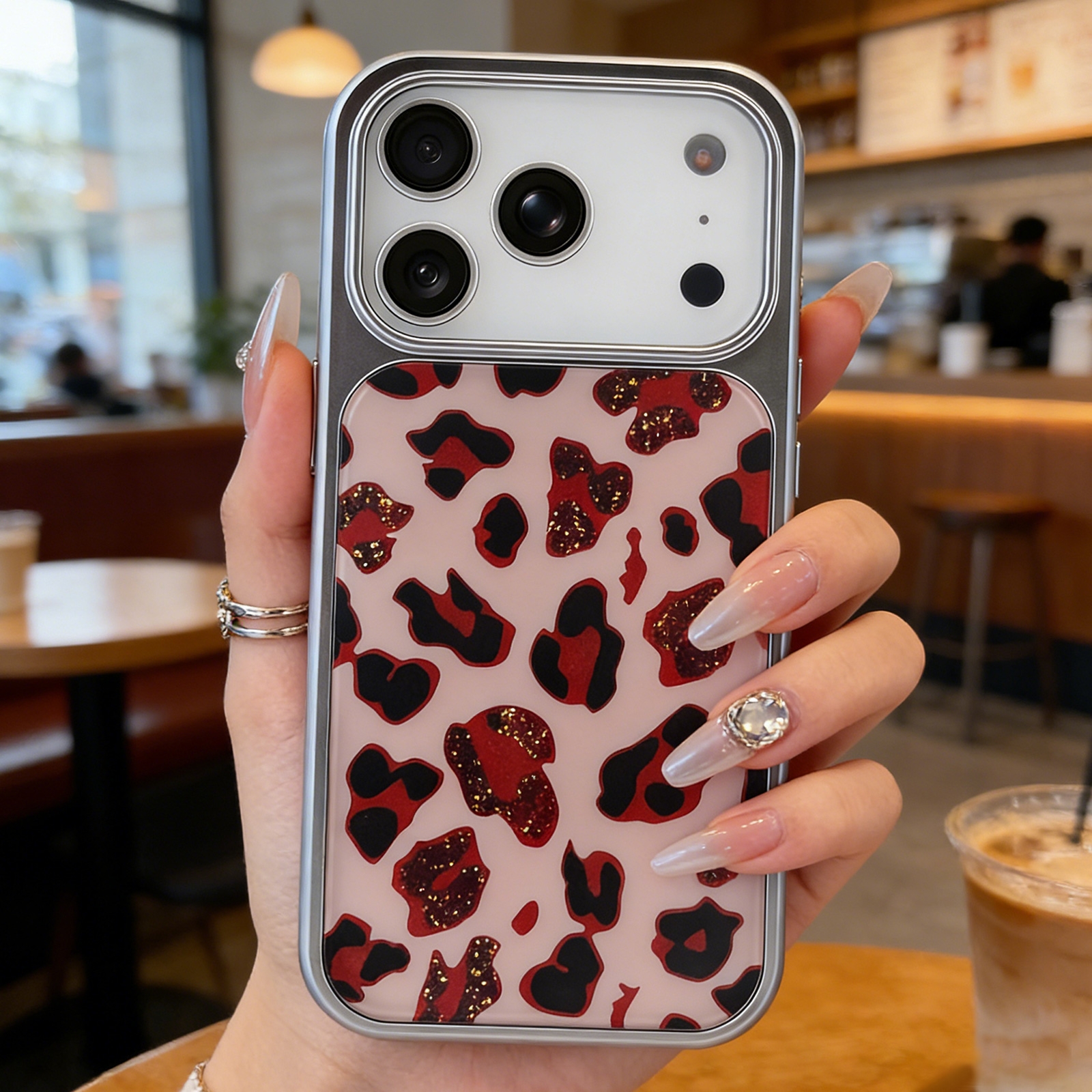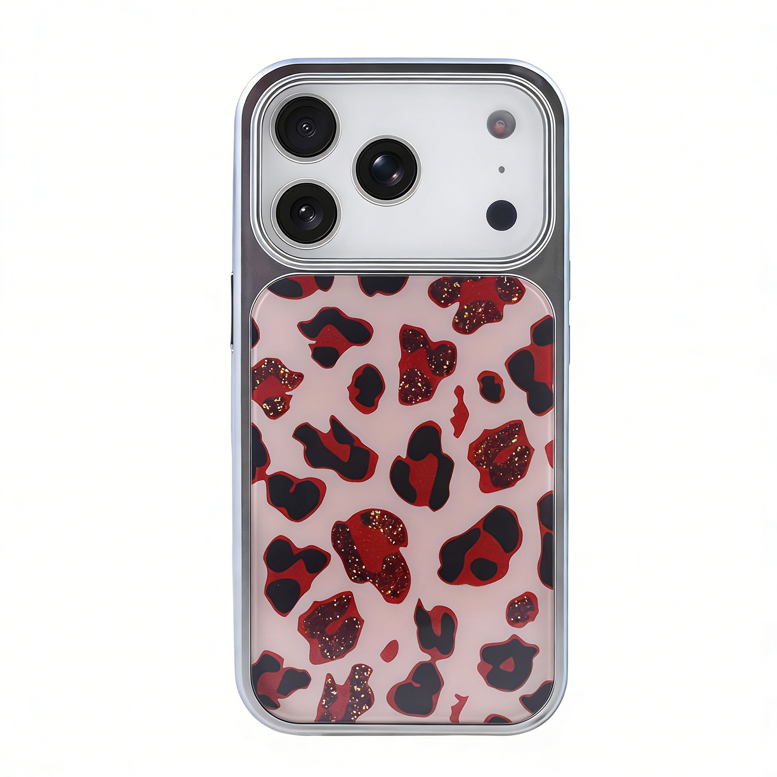 • Glitter Leopard Print Design - The back panel features a distinct leopard/cheetah pattern with black outlines and deep red centers.