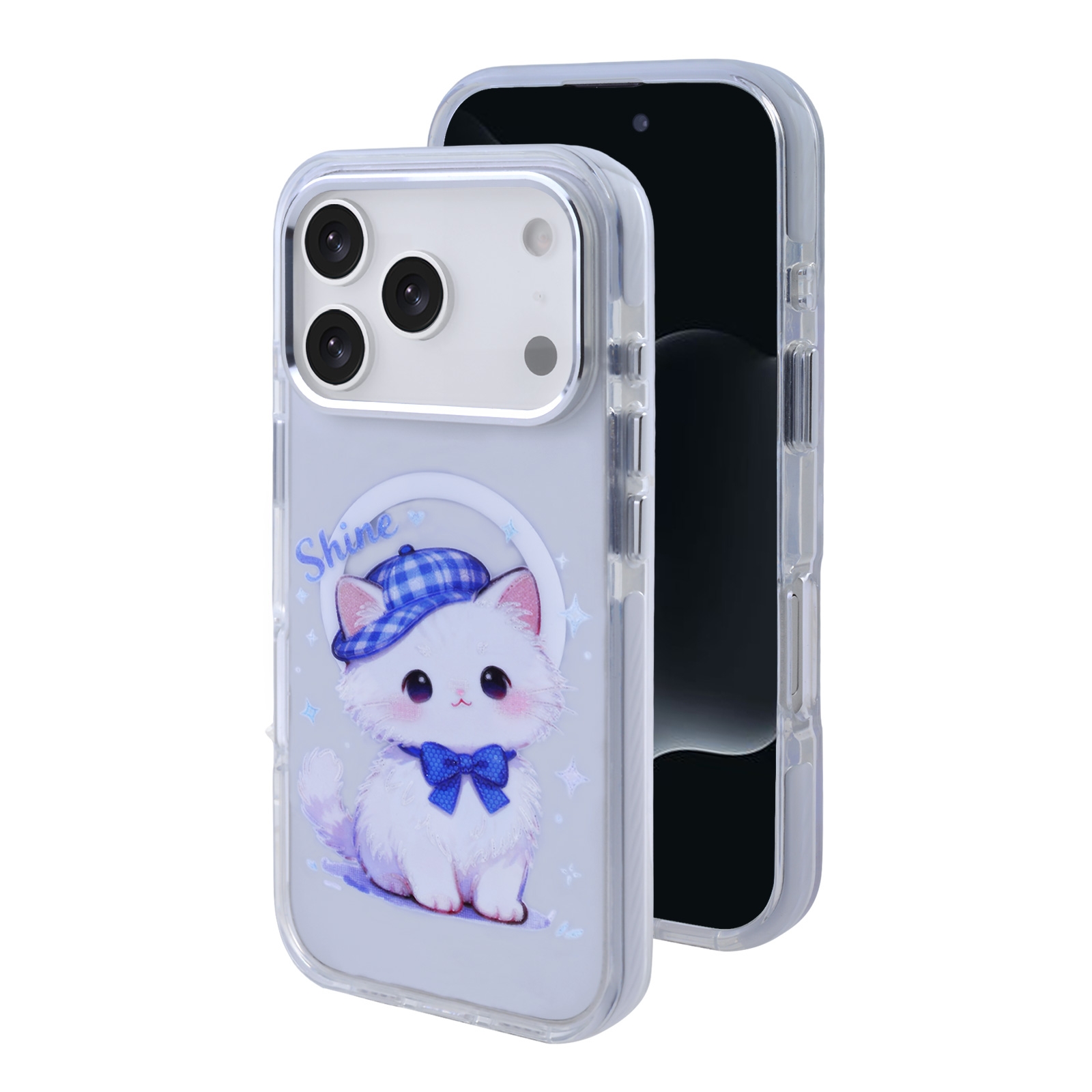 • Kawaii Cat Graphic Design: The transparent back panel features a high-resolution print of a white kitten wearing a blue plaid hat and a matching bow tie, accompanied by the text "Shine" and star accents.
