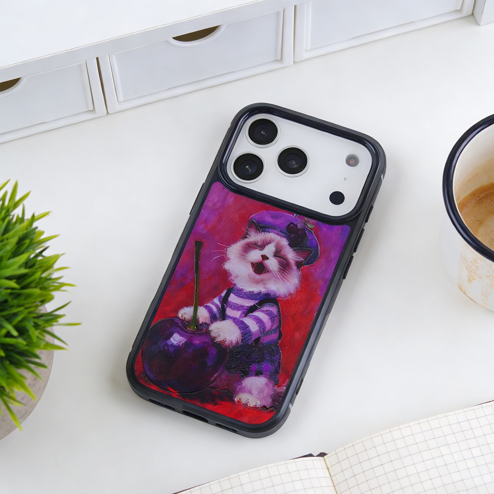 CS-UN-0170-2855PL Cute Cherry Cat Phone Case for iPhone 17 Pro Max - Vintage Oil Painting Art Print Design - Purple (1PCS)