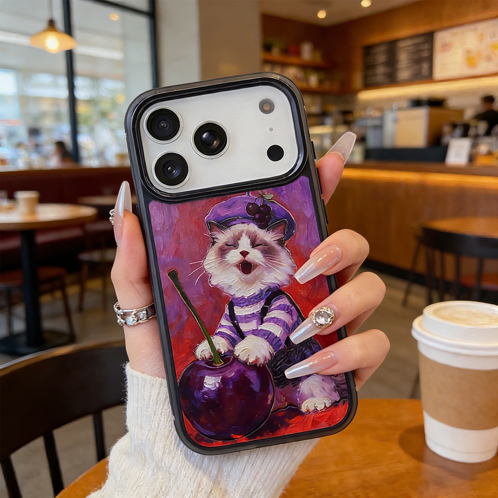 • Whimsical Cherry Cat Design - The back panel displays a vintage oil painting-style illustration of a happy cat wearing a purple beret and striped shirt, hugging a large dark cherry.