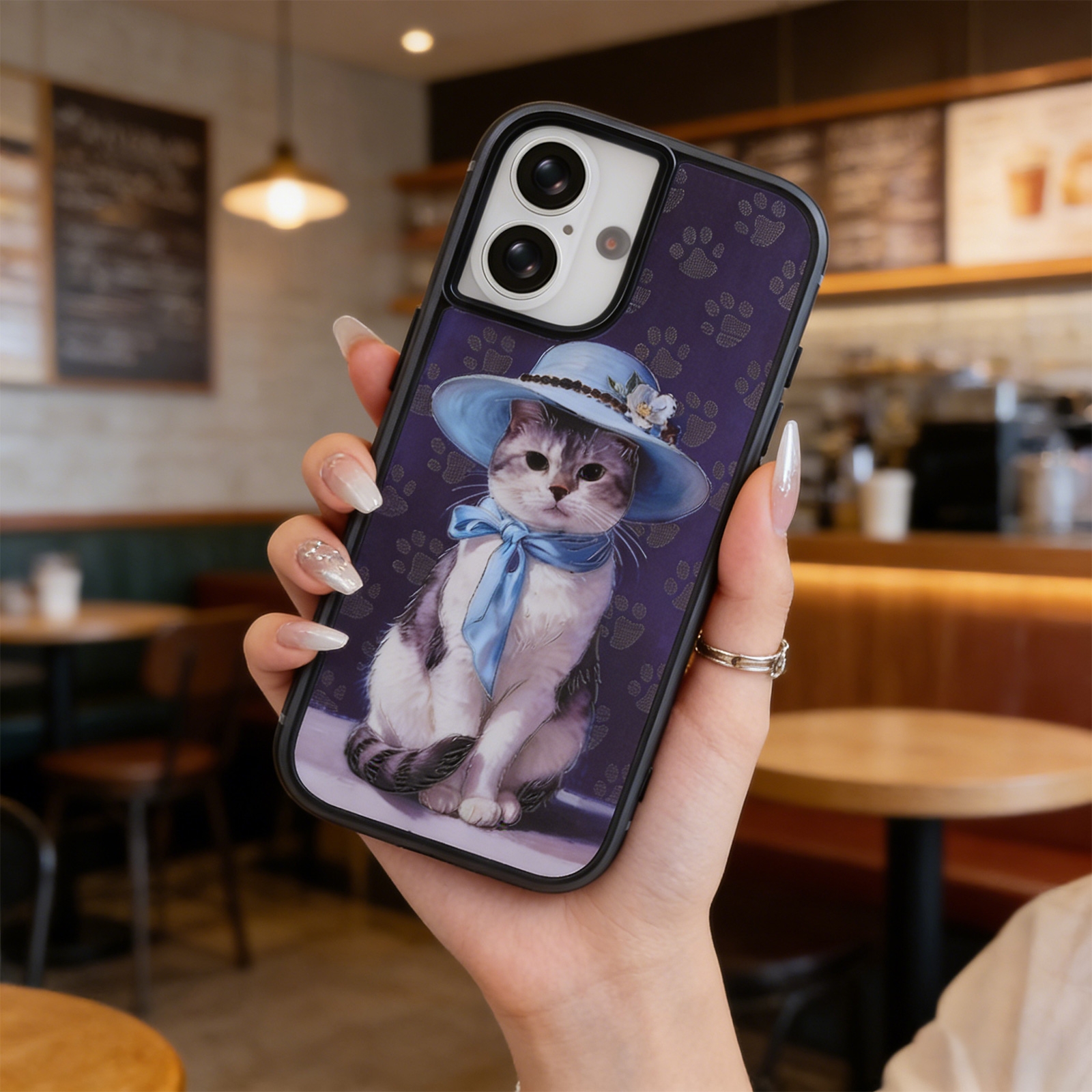 • Elegant Lady Cat Art Design - The back panel showcases a classic oil painting-style portrait of a cat dressed as an elegant lady, wearing a wide-brimmed blue hat with flowers and a matching blue bow scarf.