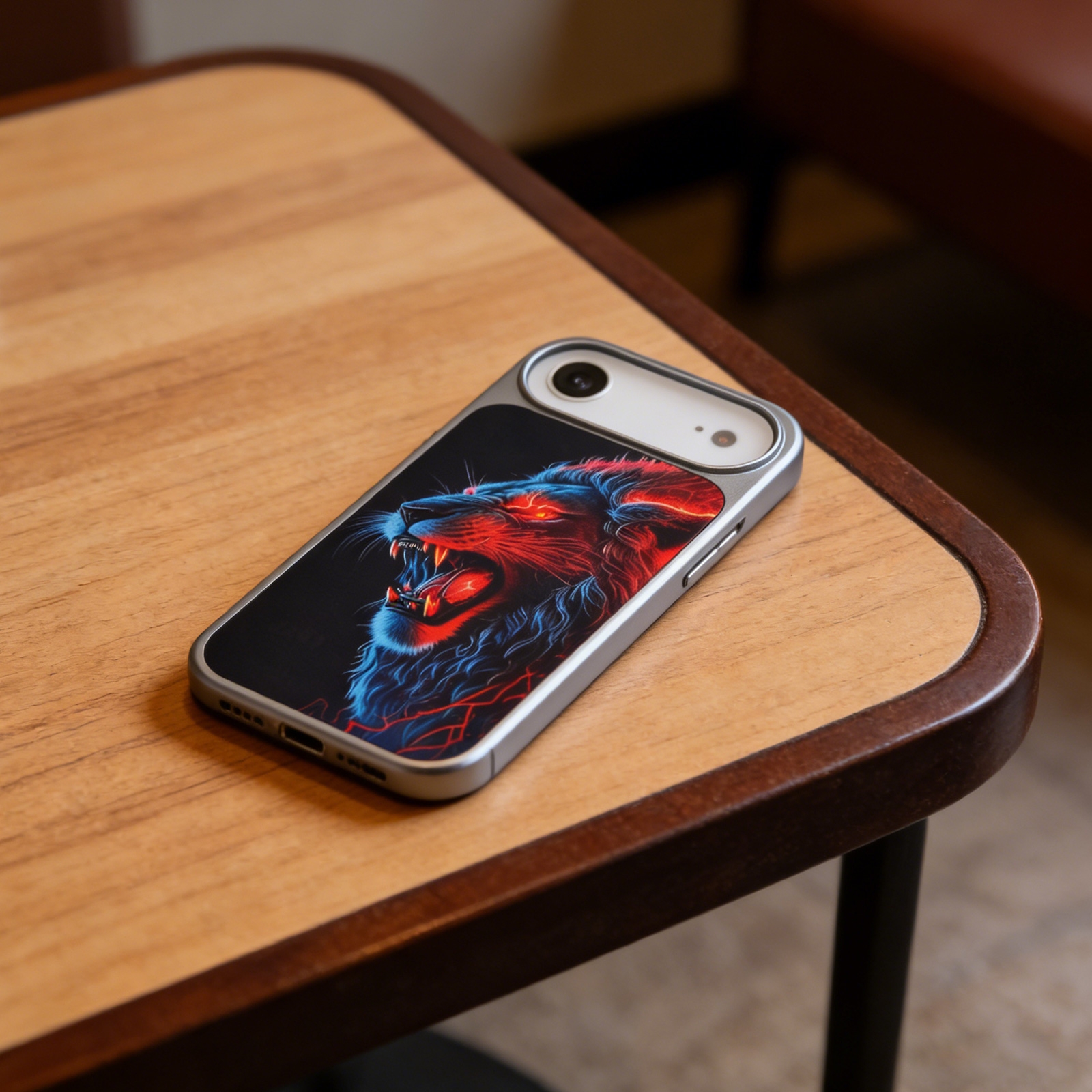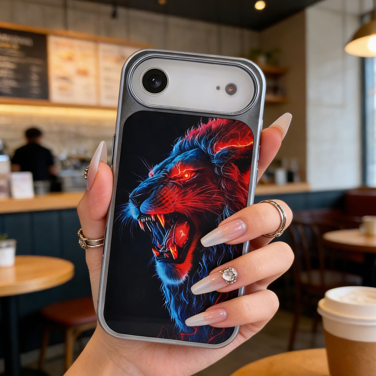 • Vivid Neon Art Graphic - The back panel showcases a high-contrast illustration of a roaring lion, accented with electric red and blue neon glow effects against a solid dark background.
