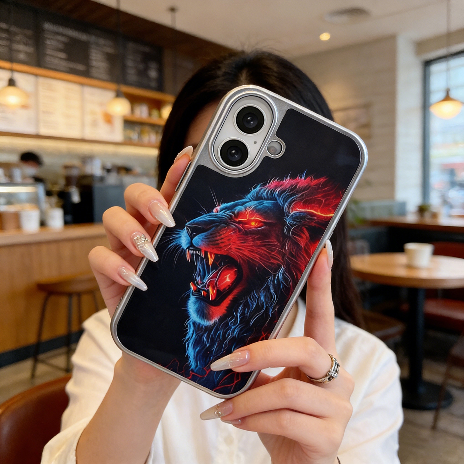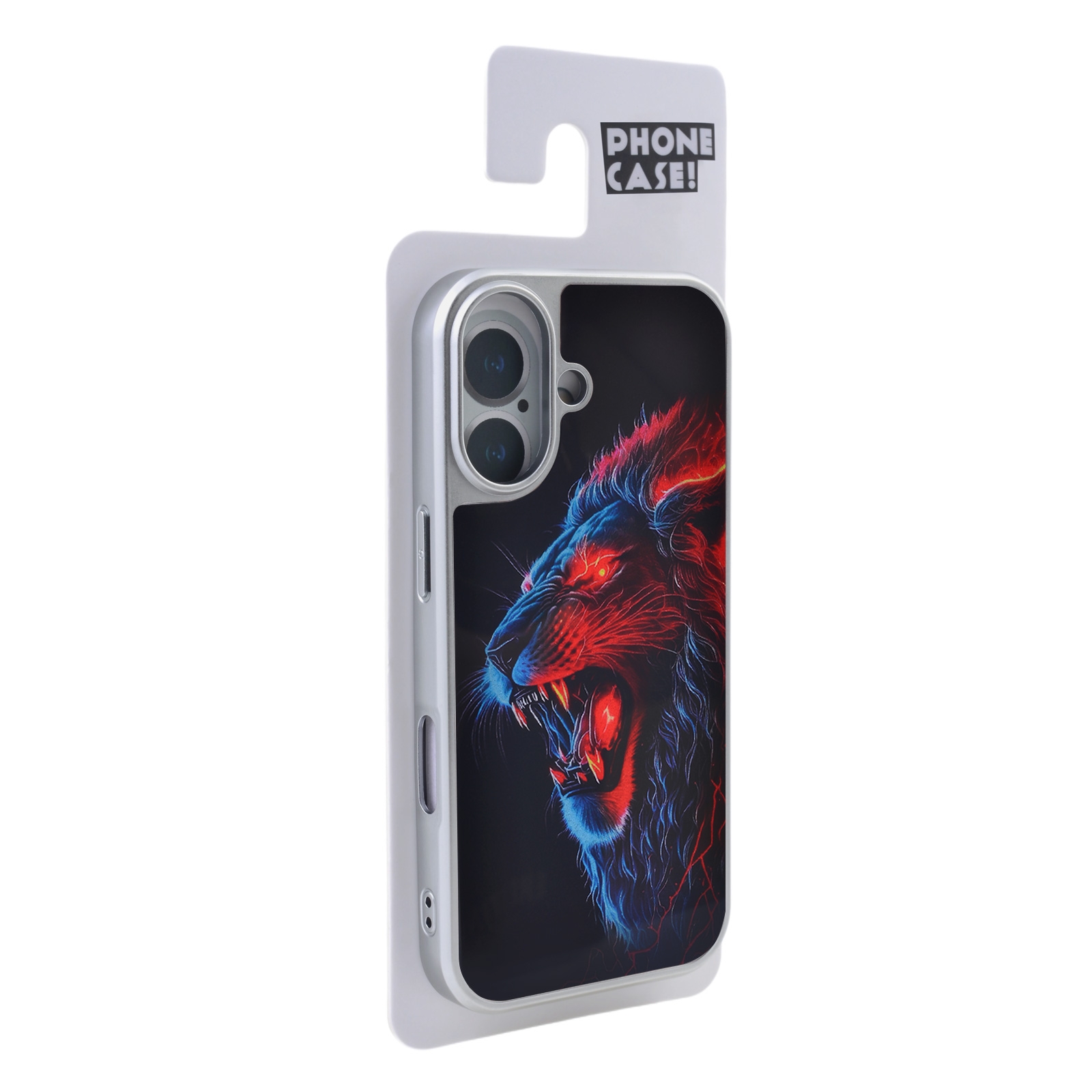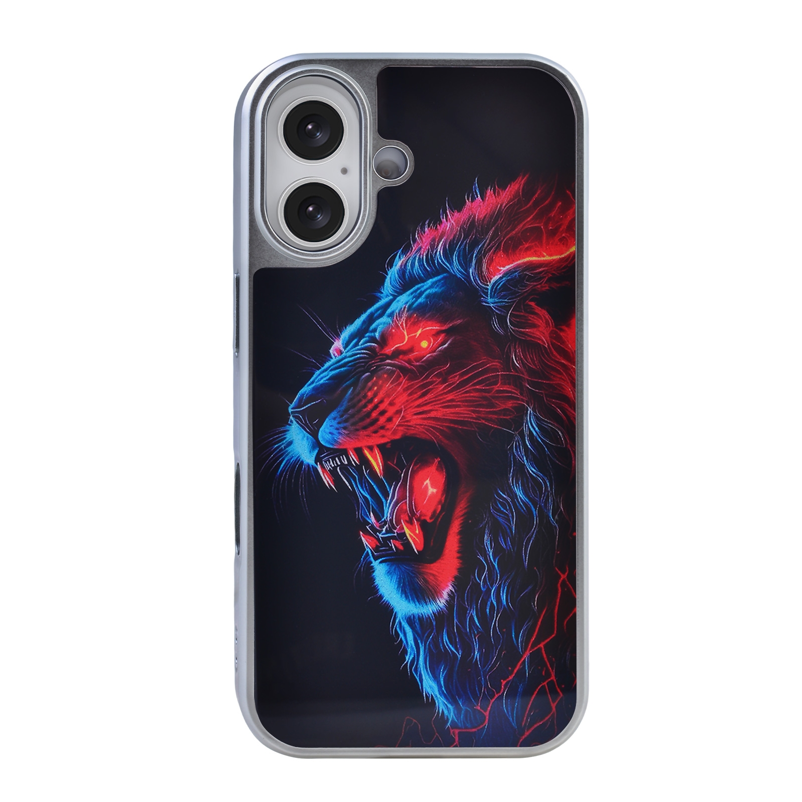 • Vivid Neon Art Graphic - The back panel showcases a high-contrast illustration of a roaring lion, accented with electric red and blue neon glow effects against a solid dark background.