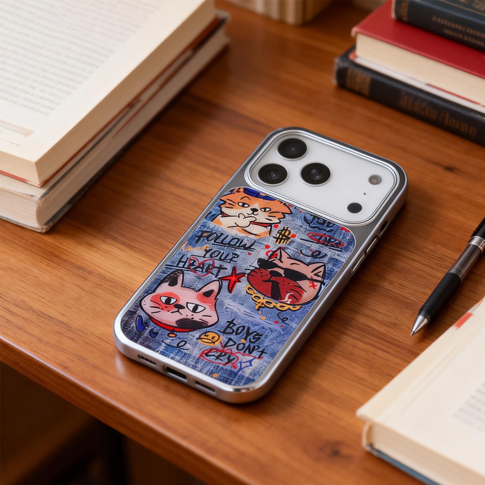 CS-UN-0182-2854BU Denim Style Graffiti Cat Magnetic Case for iPhone 17 Pro - Electroplated Frame Protective Phone Cover (1PCS)