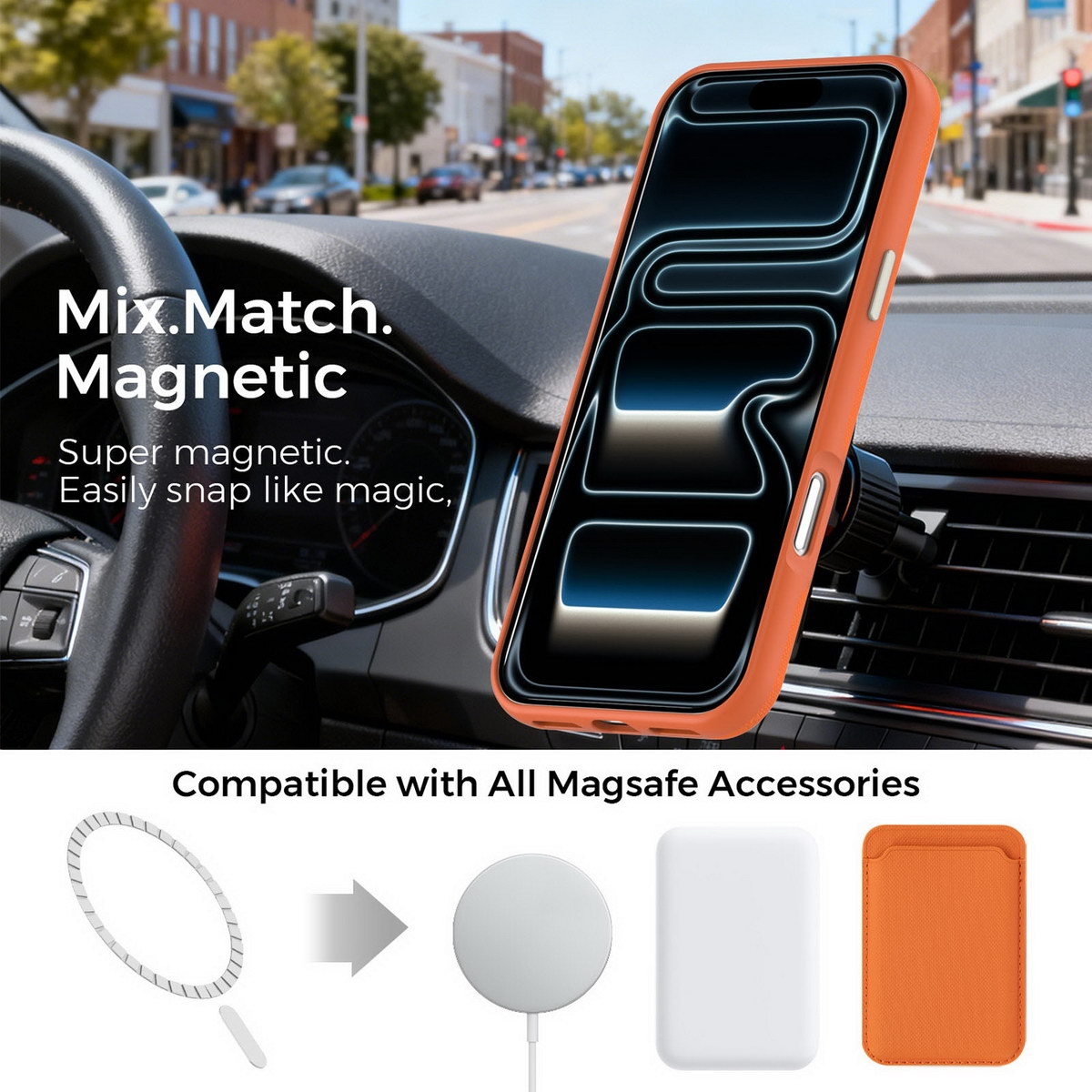 • Integrated Magnetic Alignment: Contains a built-in magnetic ring that aligns precisely with charging coil. It ensures stable attachment to MagSafe wireless chargers, magnetic car mounts, and wallet accessories.