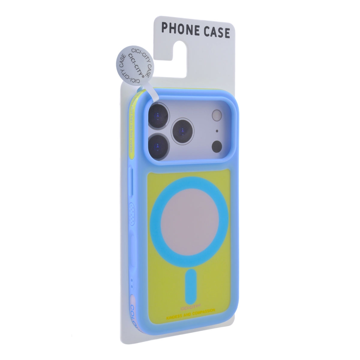 • Pastel Color Block Design: The case features a distinct two-tone aesthetic with a pastel blue border and a frosted yellow back panel. The center magnetic ring area includes a printed inspirational quote for a unique typographic look.