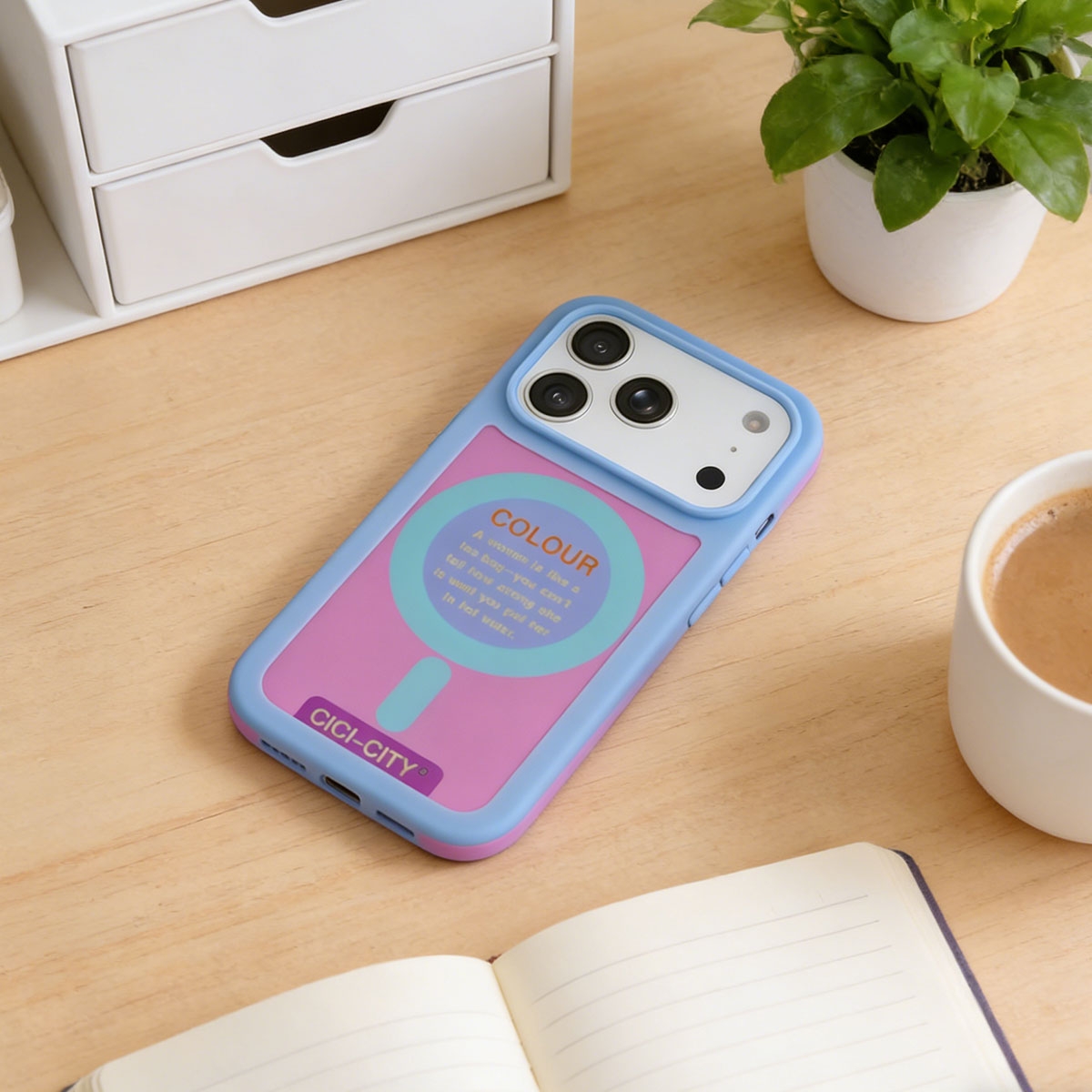 • Pastel Color Block Design: The case features a distinct two-tone aesthetic with a pastel blue border and a frosted pinkish-purple back panel. The center magnetic ring area includes a printed inspirational quote for a unique typographic look.