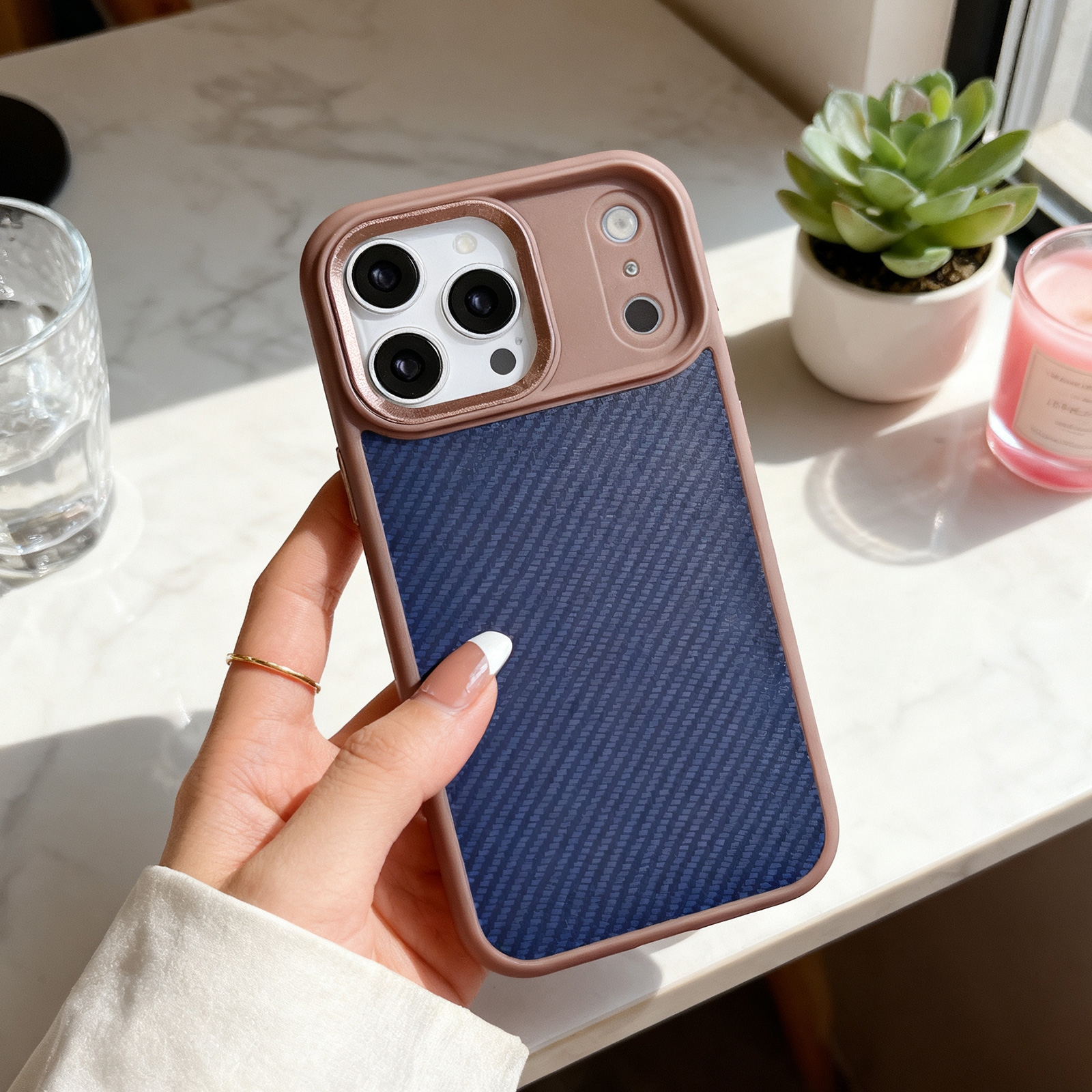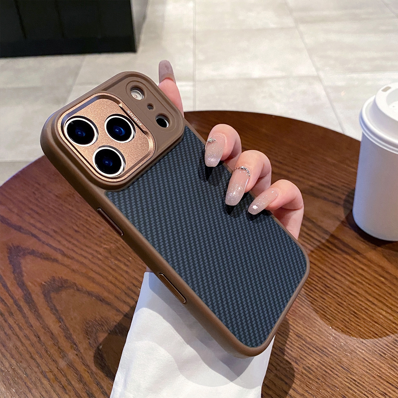 • Brown Frame Accent: Brown border contrasts with dark carbon fiber texture for a modern appearance.