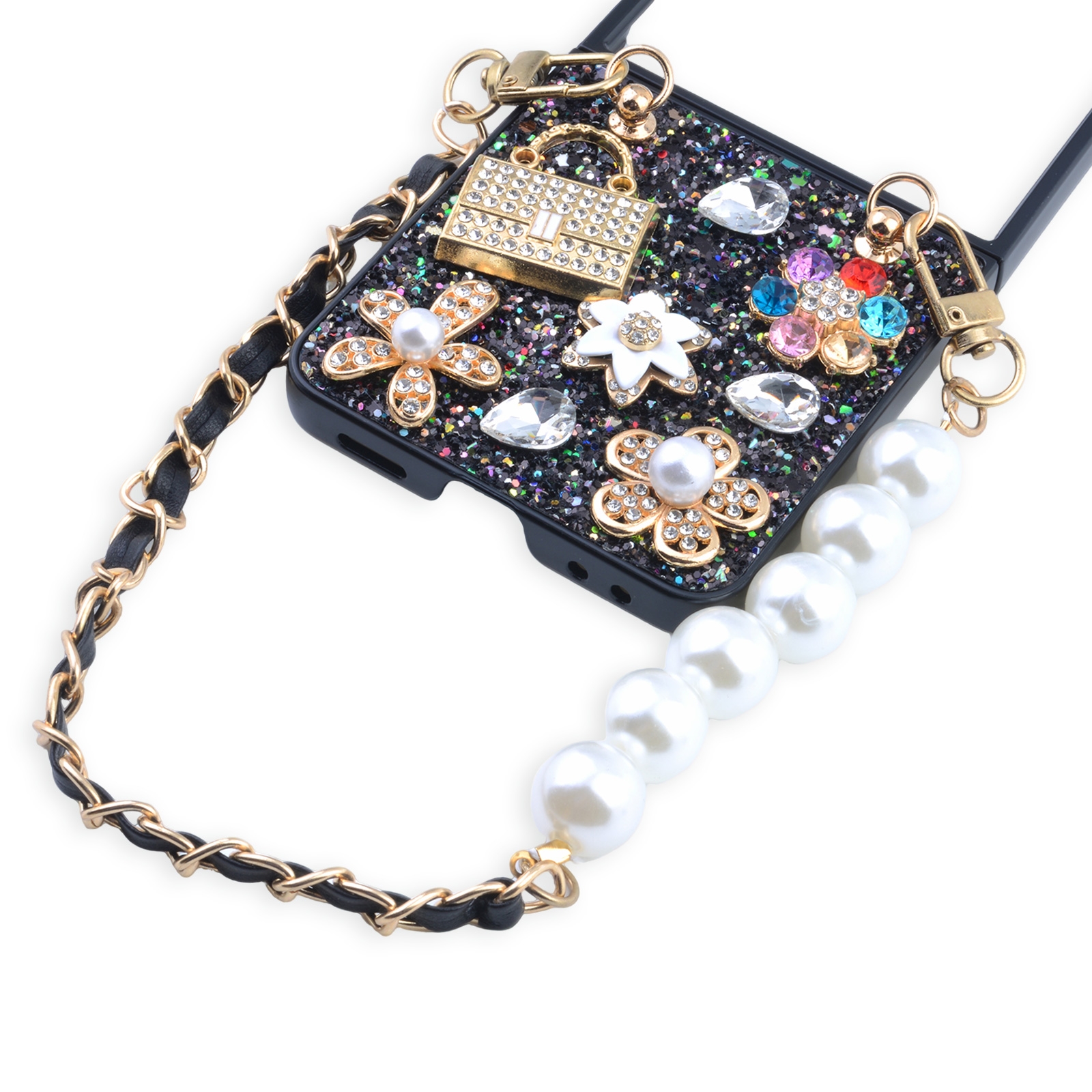 CS-UN-0060-2893BK Glitter Rhinestone Case for Z Flip7 with Pearl Leather Chain Strap - Black (1PCS)