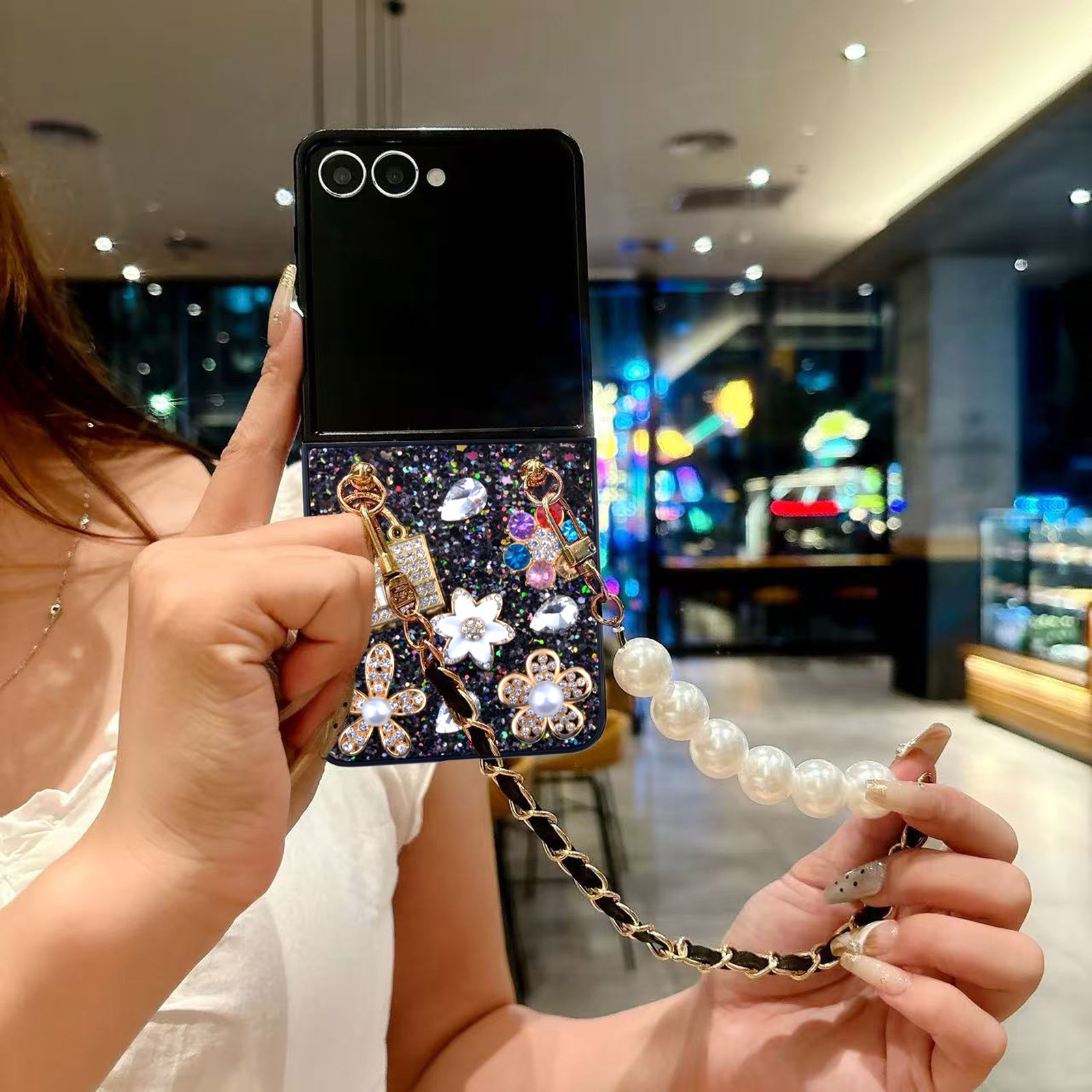 Glitter Rhinestone Case for Z Flip7 with Pearl Leather Chain Strap, Black