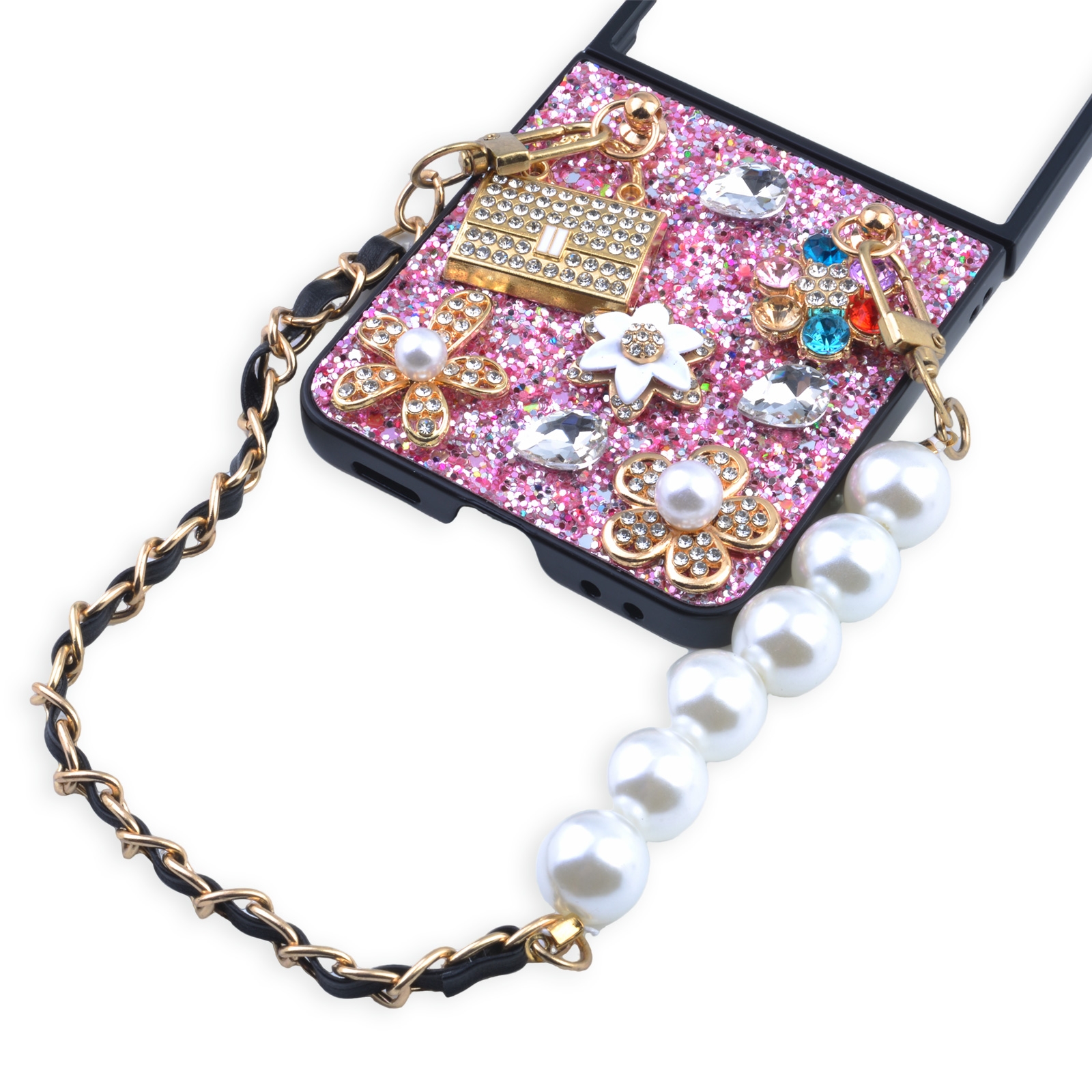 CS-UN-0060-2893PK Glitter Rhinestone Case for Z Flip7 with Pearl Leather Chain Strap - Pink (1PCS)