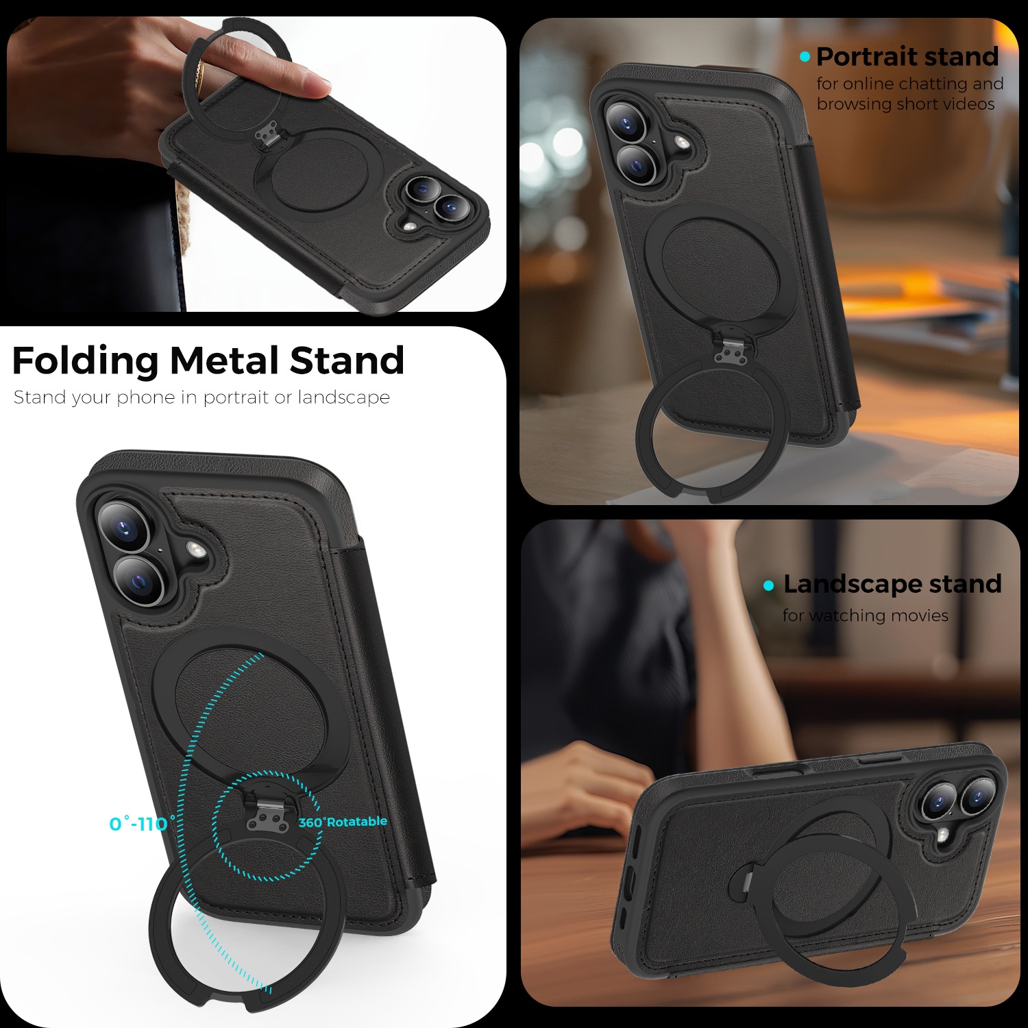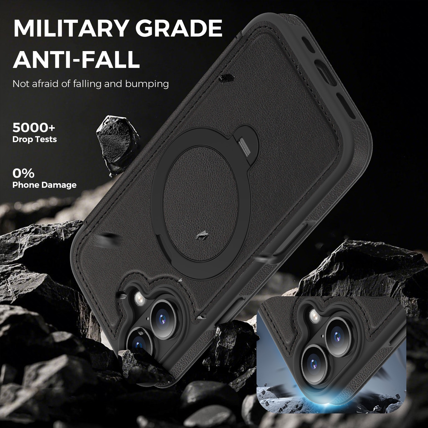 CS-UN-0115-2852BK 360° Rotating Stand iPhone 17 Case - Magnetic Wireless Charging PU Cover - Black (1PCS)
