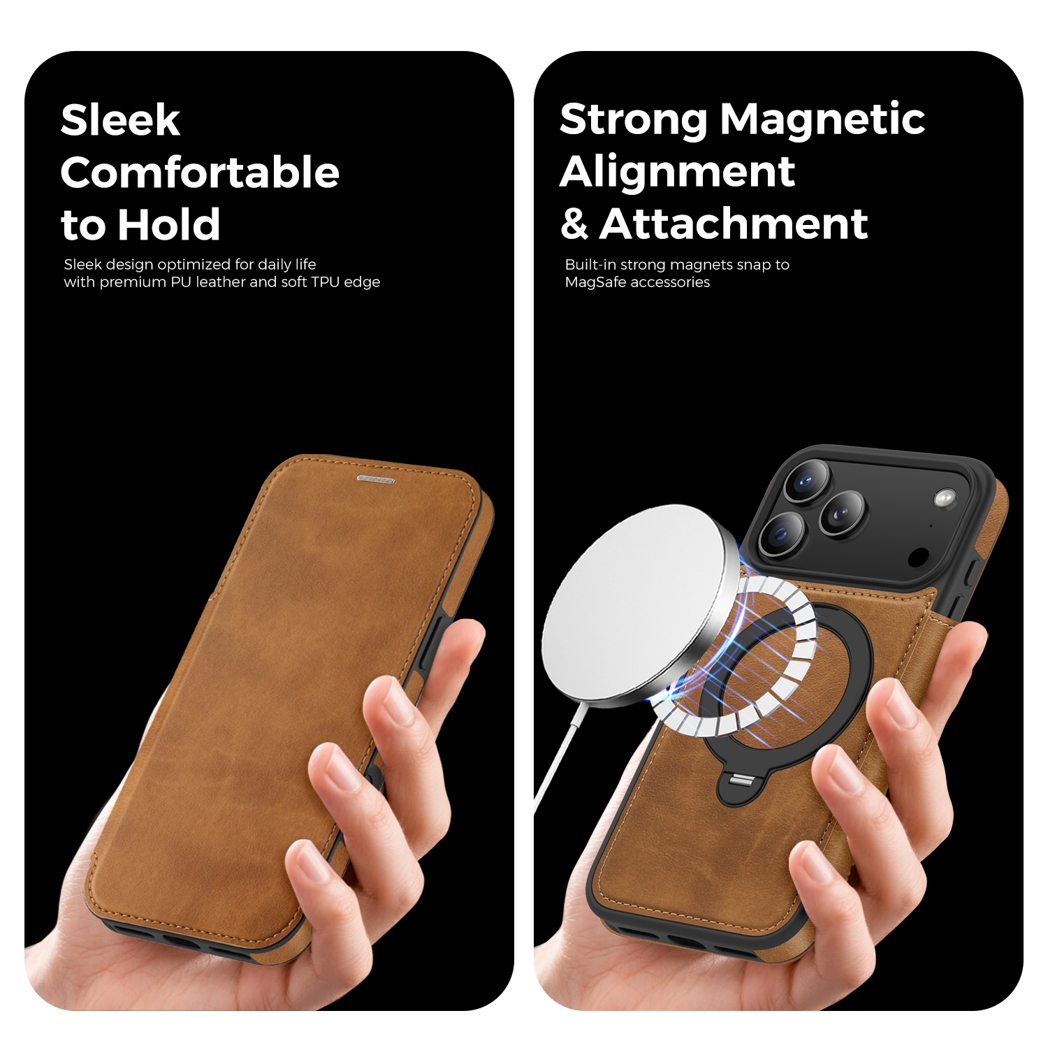 360° Rotating Stand iPhone 17 Pro Max Case - Magnetic Wireless Charging PU Cover - Brown