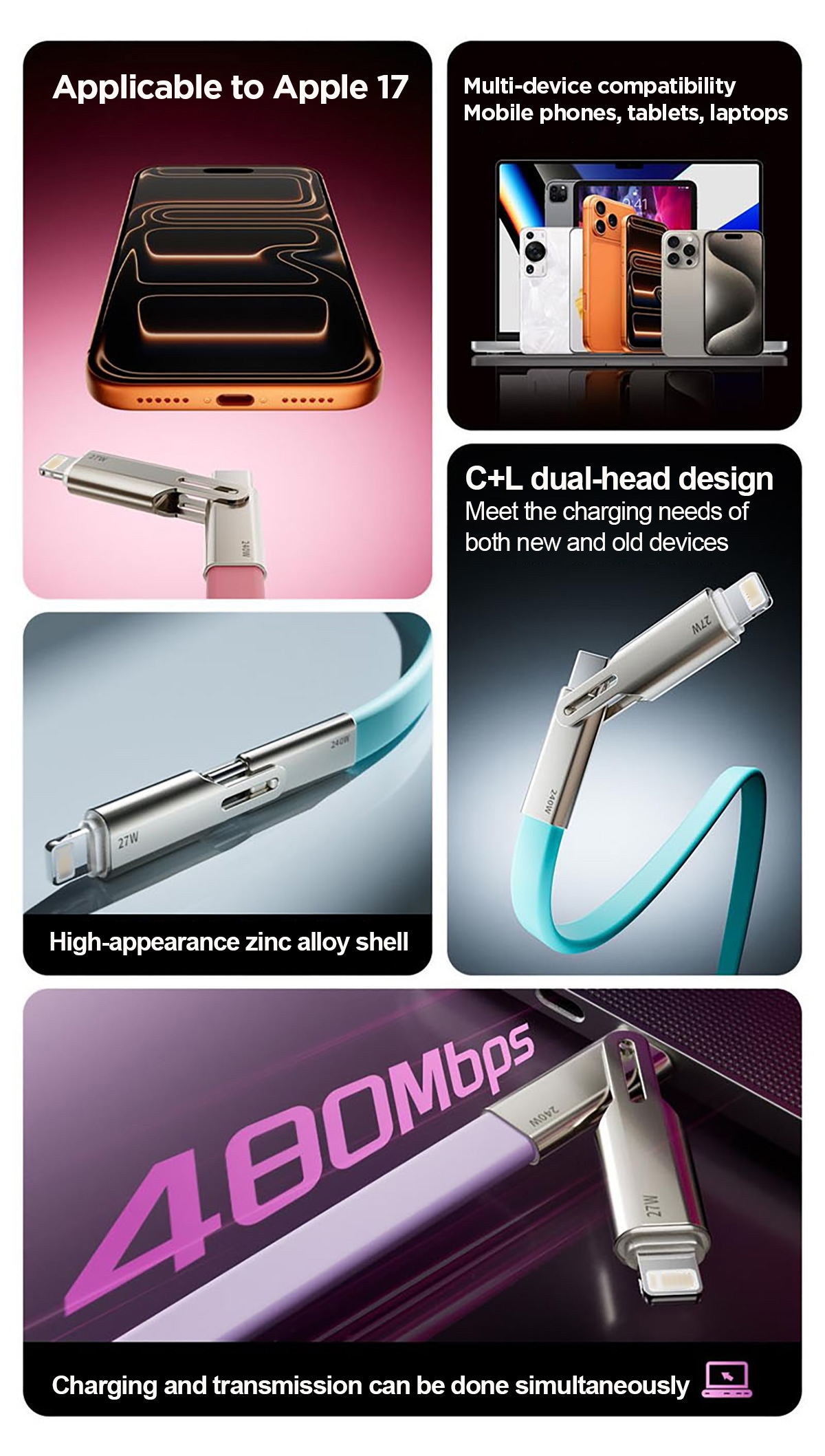 • Dual Connector Design (USB-C + Lightning) -  This cable features a versatile 2-in-1 head design, integrating both USB-C and Lightning connectors.