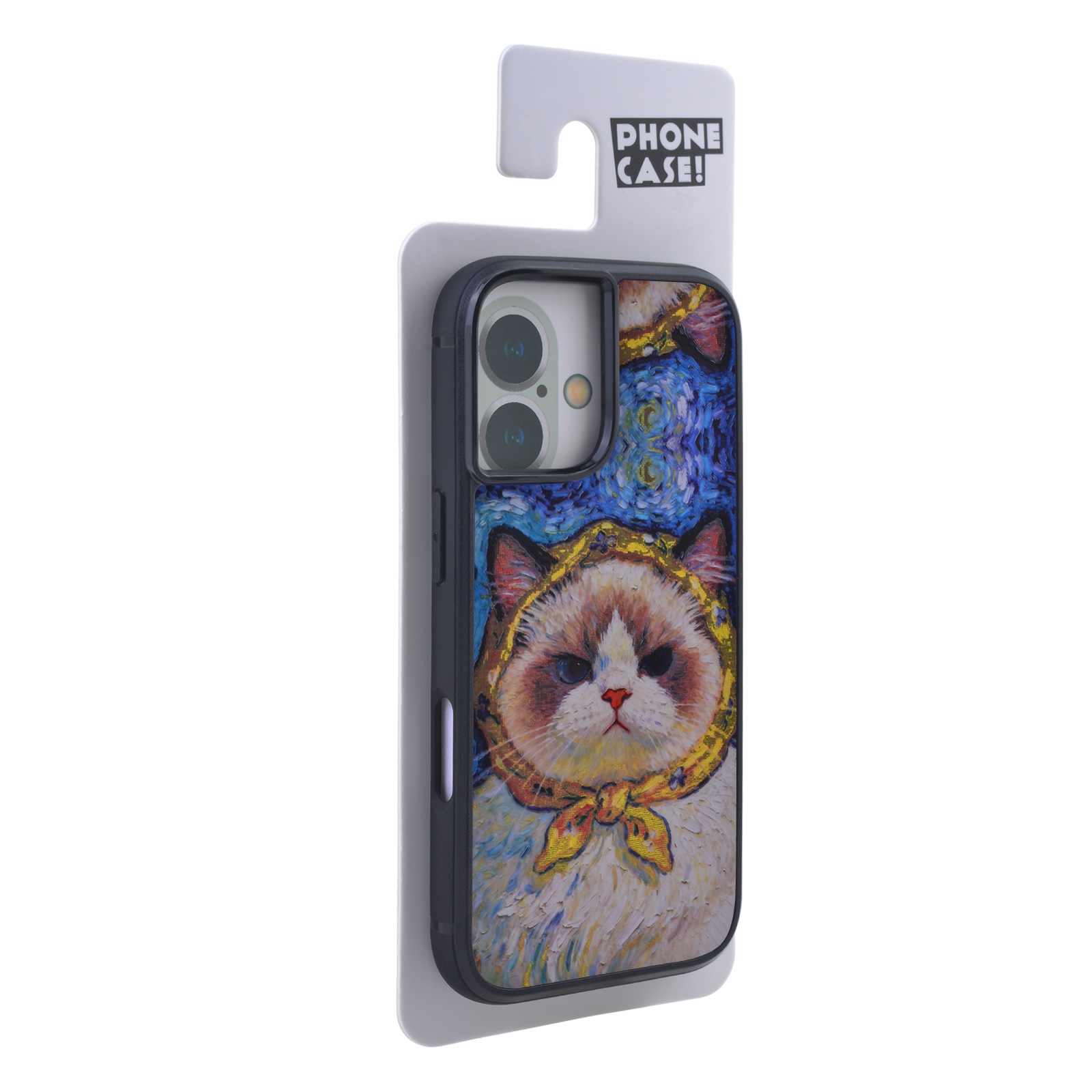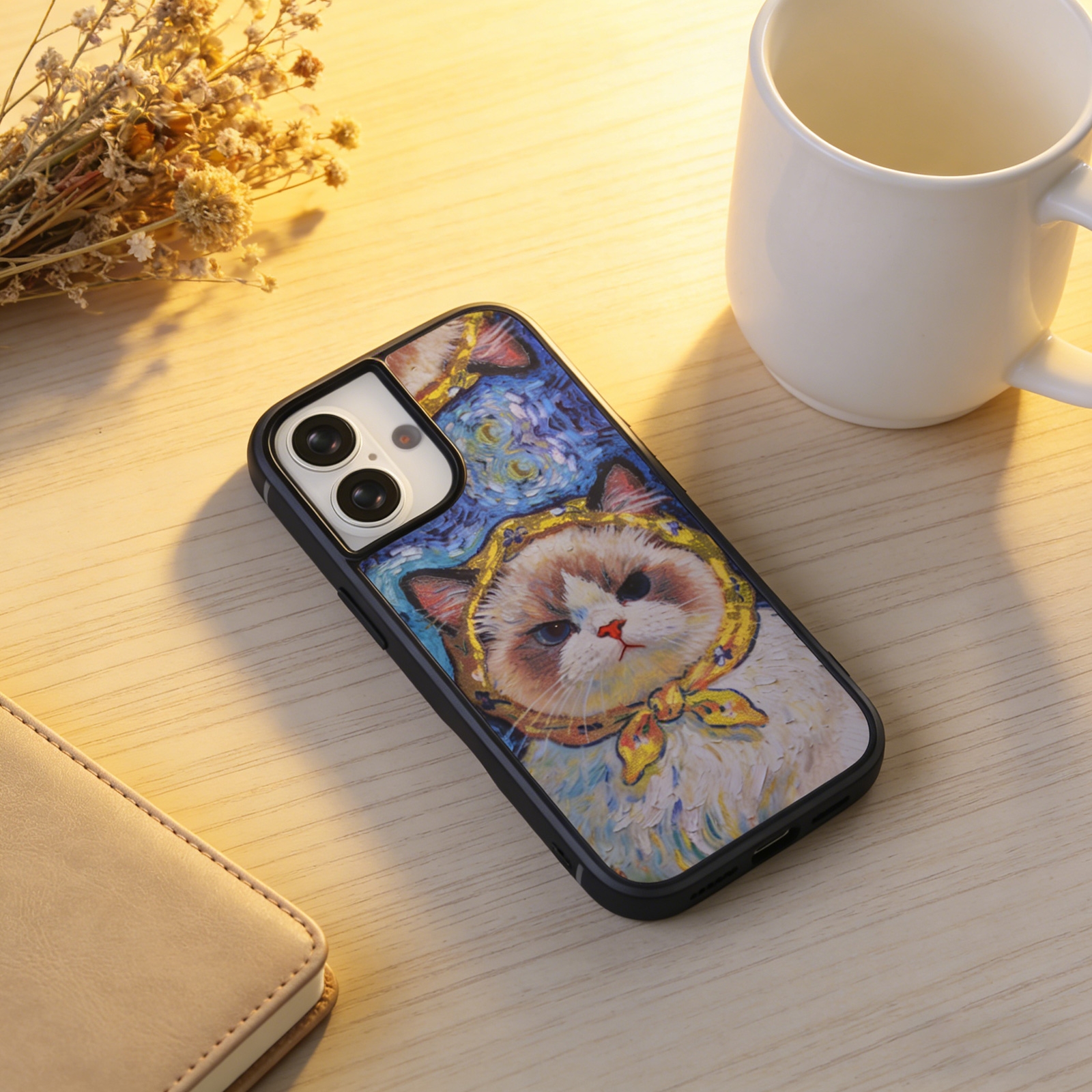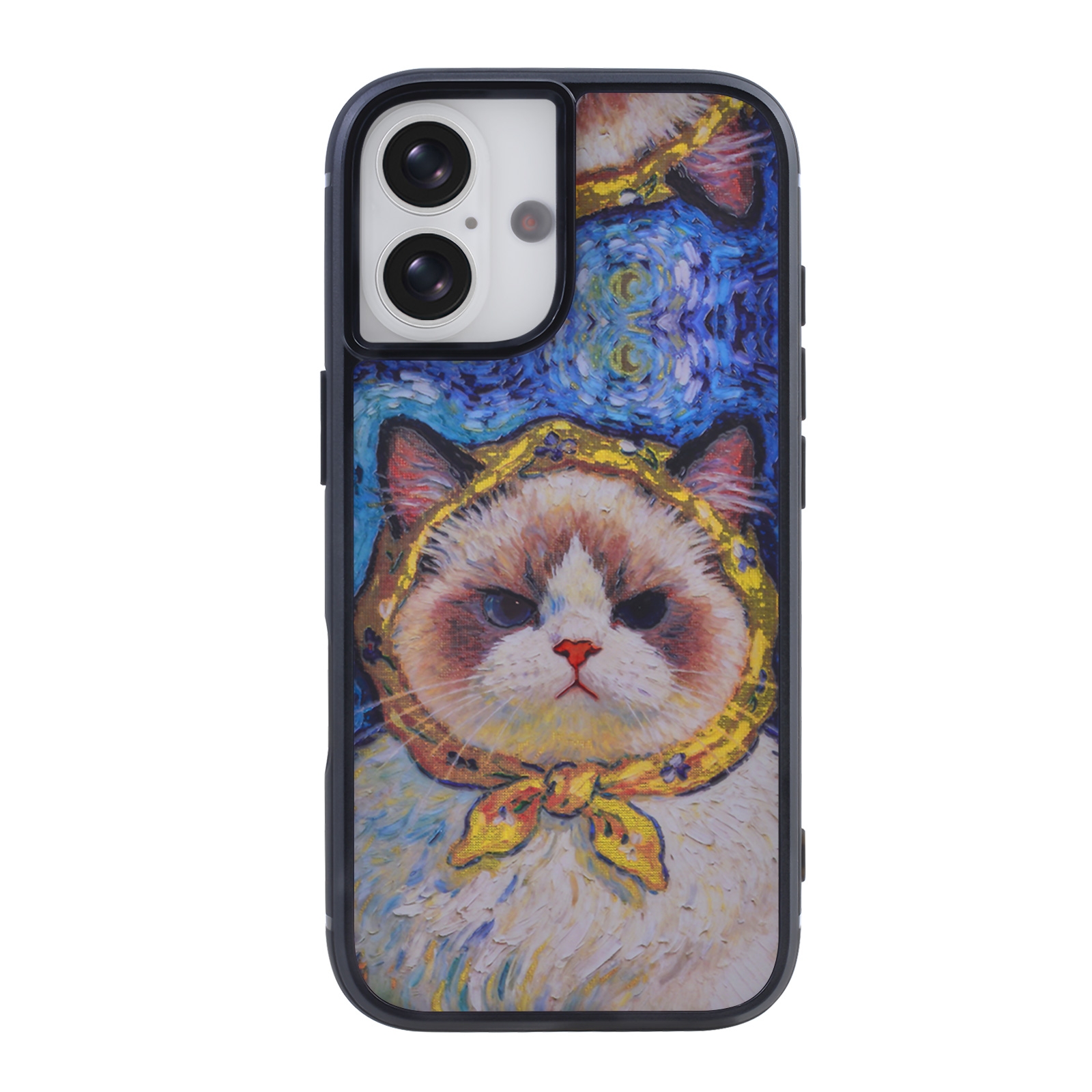 • Artistic Starry Night Cat Design -  The back panel showcases a unique oil painting-style illustration of a Ragdoll cat wearing a yellow headscarf, set against a background inspired by Van Gogh's "The Starry Night".