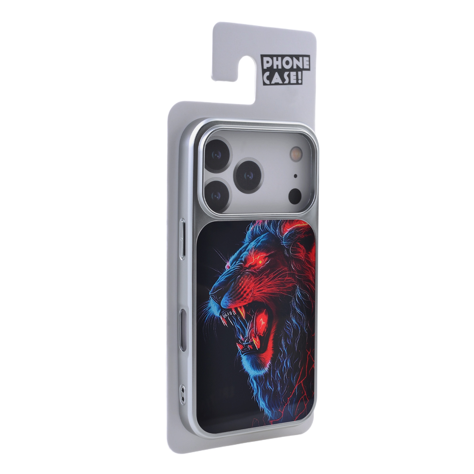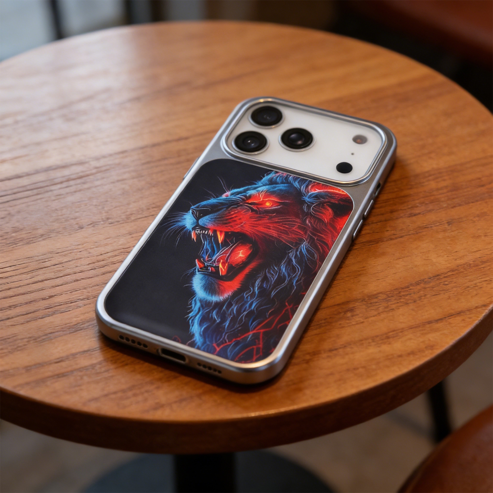• Vivid Neon Art Graphic - The back panel showcases a high-contrast illustration of a roaring lion, accented with electric red and blue neon glow effects against a solid dark background.