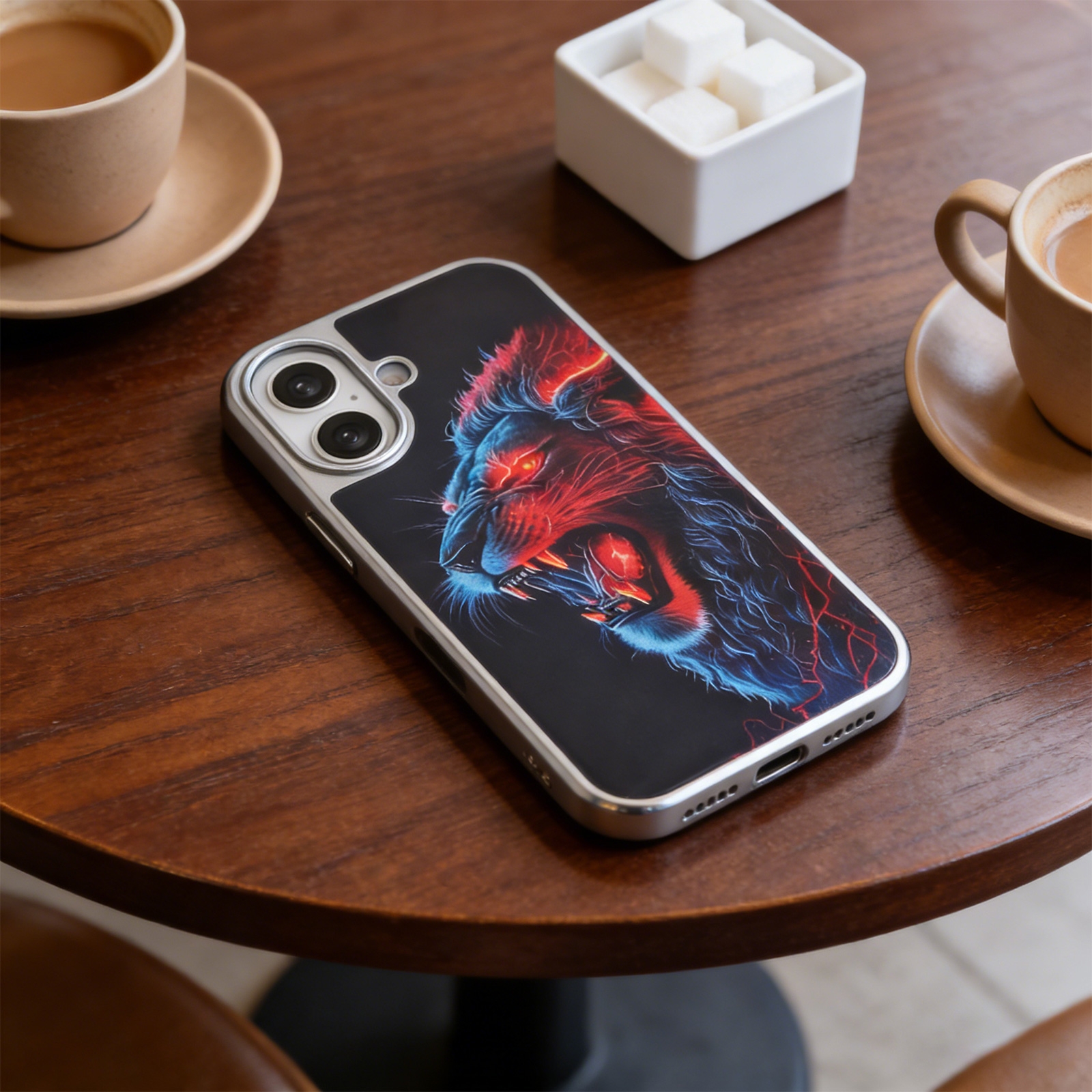 • Vivid Neon Art Graphic - The back panel showcases a high-contrast illustration of a roaring lion, accented with electric red and blue neon glow effects against a solid dark background.