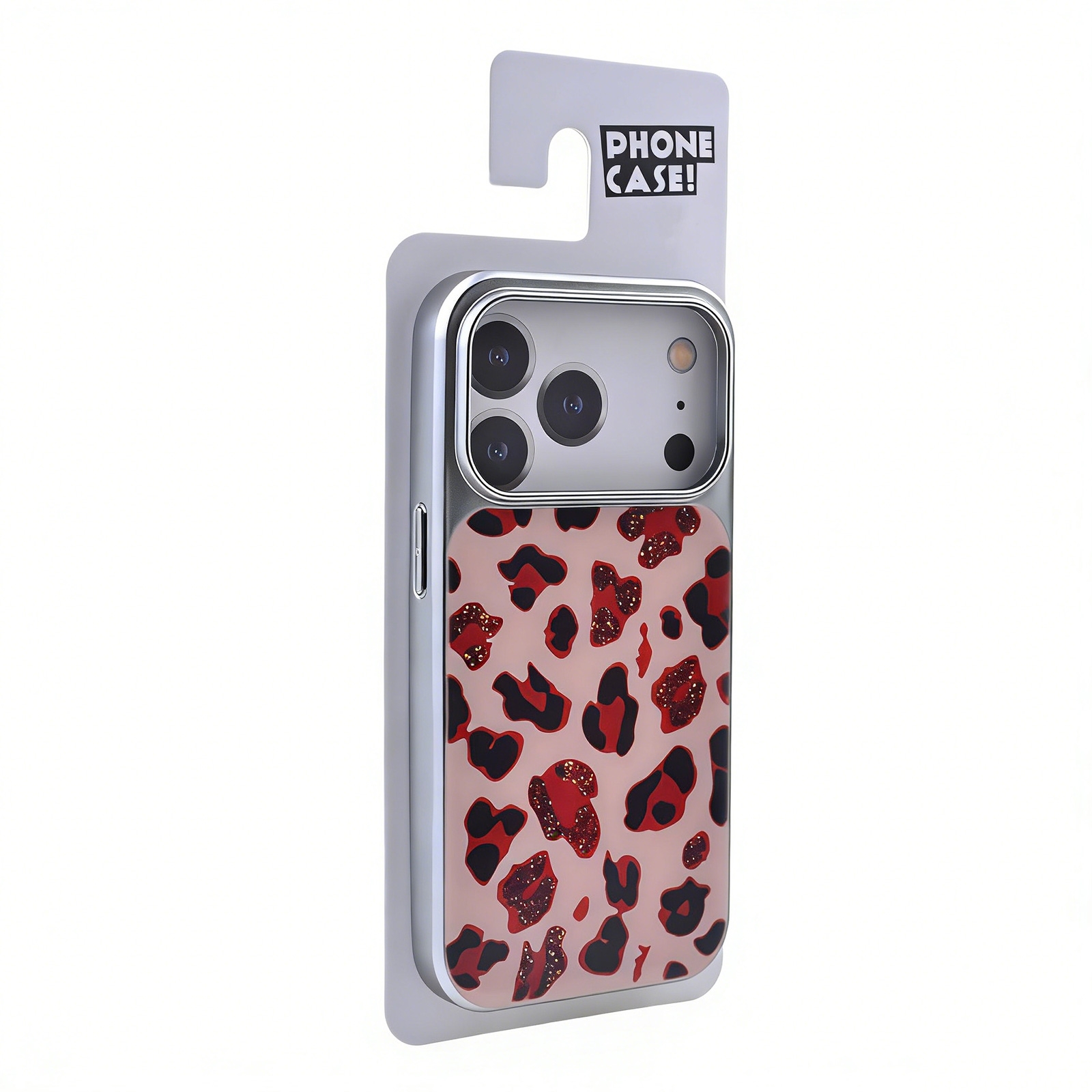 • Glitter Leopard Print Design - The back panel features a distinct leopard/cheetah pattern with black outlines and deep red centers.