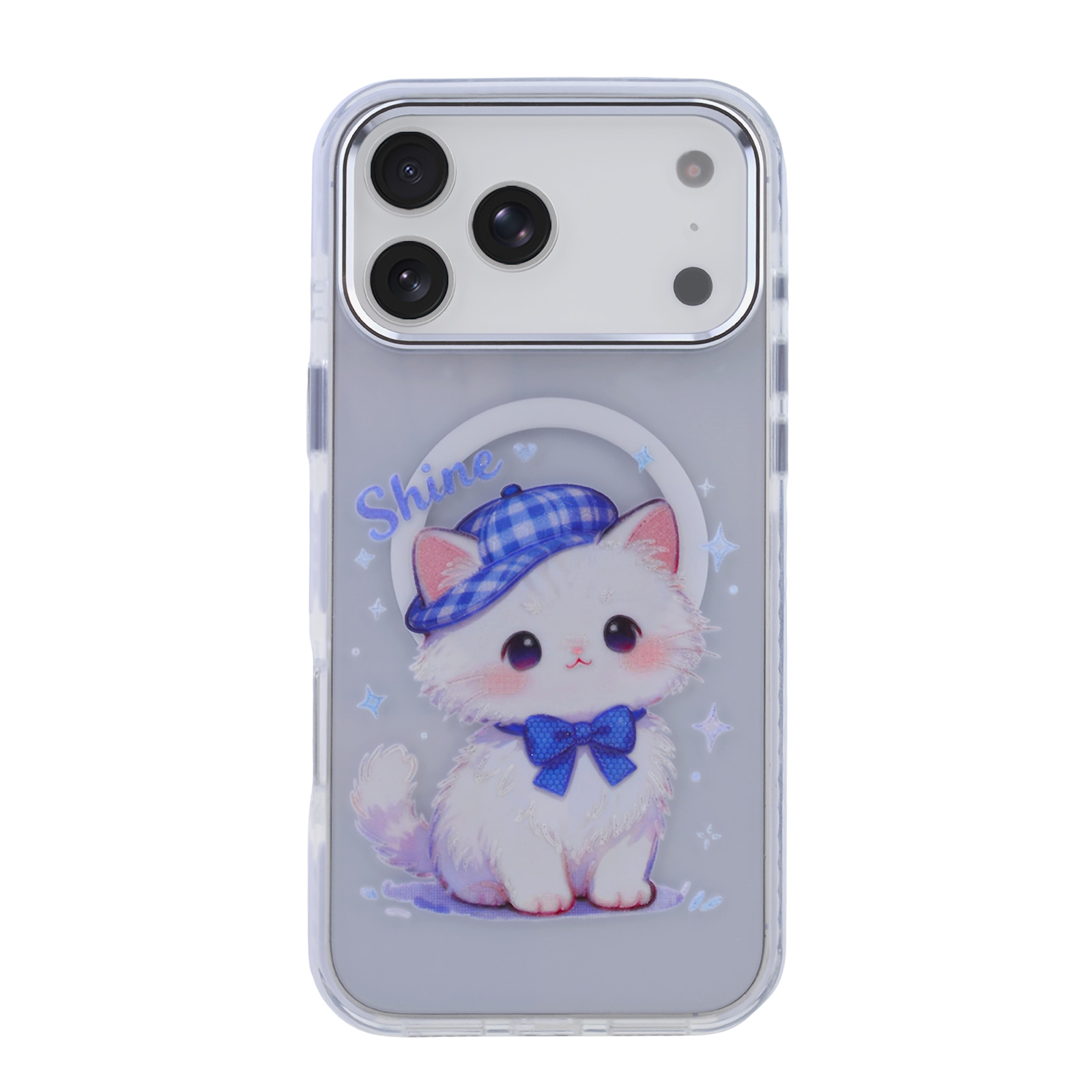• Kawaii Cat Graphic Design: The transparent back panel features a high-resolution print of a white kitten wearing a blue plaid hat and a matching bow tie, accompanied by the text "Shine" and star accents.