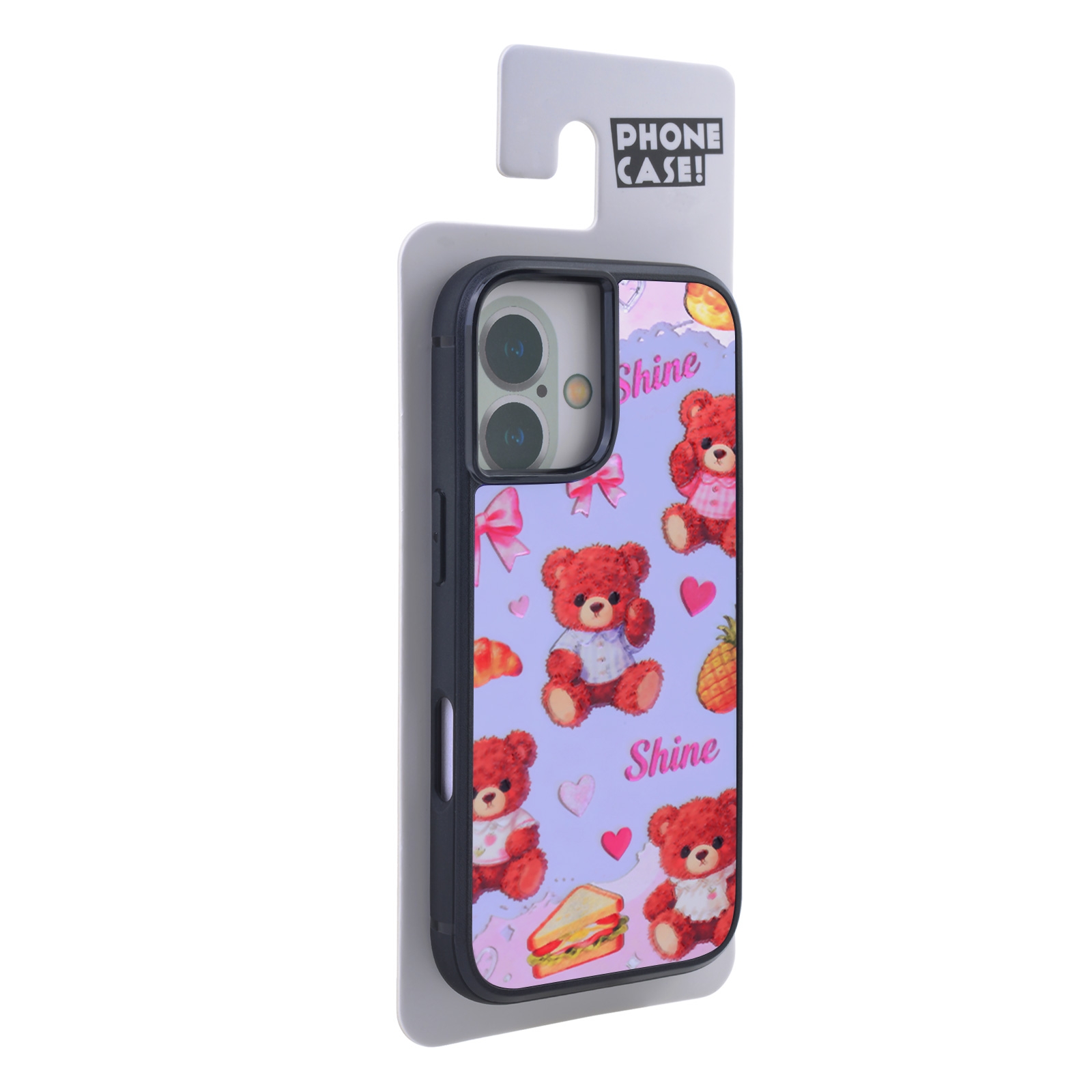 • Coquette Aesthetic Graphic: The back panel displays a high-resolution print featuring textured red teddy bears, bows, hearts, and the text "Shine" set against a solid lavender background.