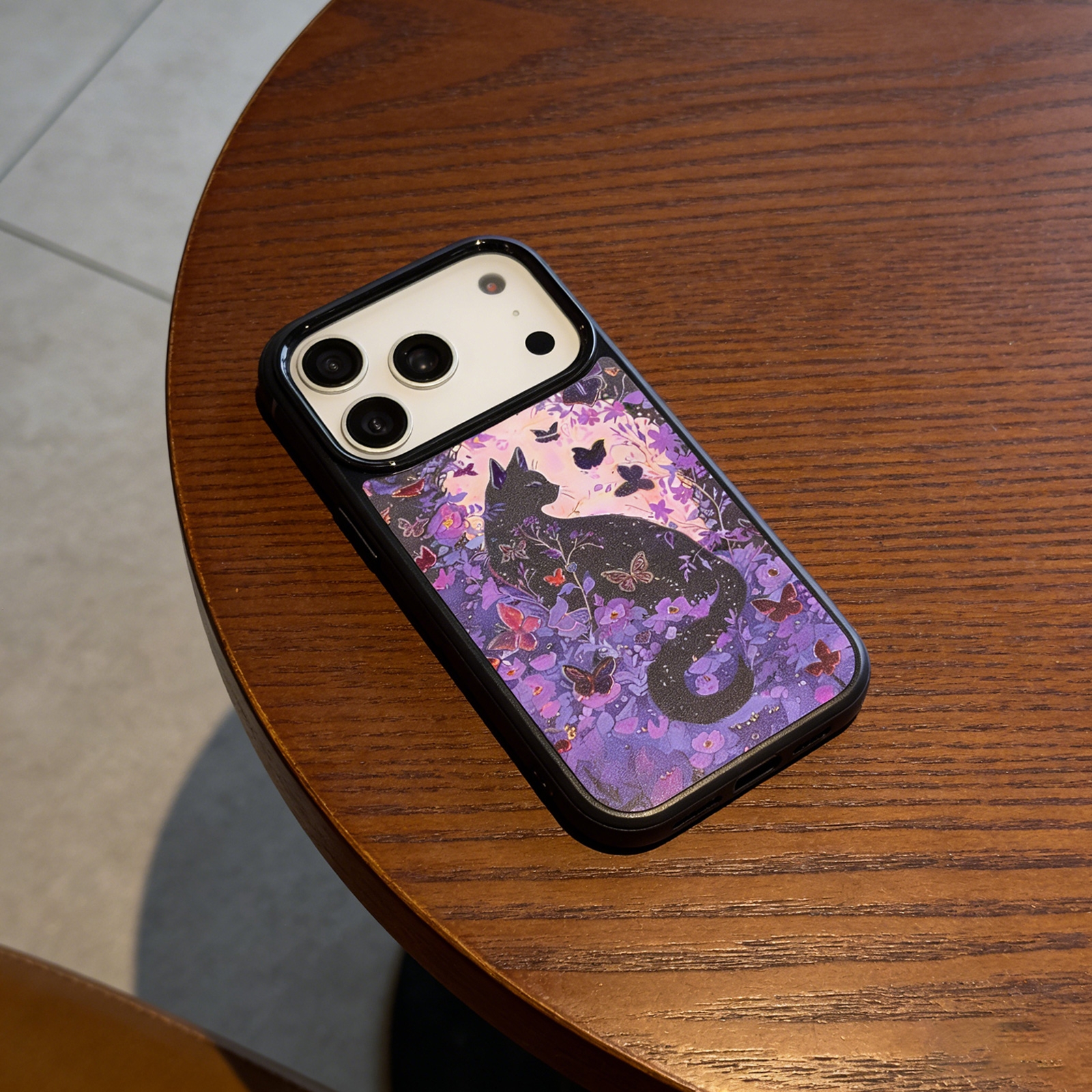 • Mystical Art Graphic Design: The back panel displays a high-resolution illustration of a black cat silhouette surrounded by purple flowers and butterflies.
